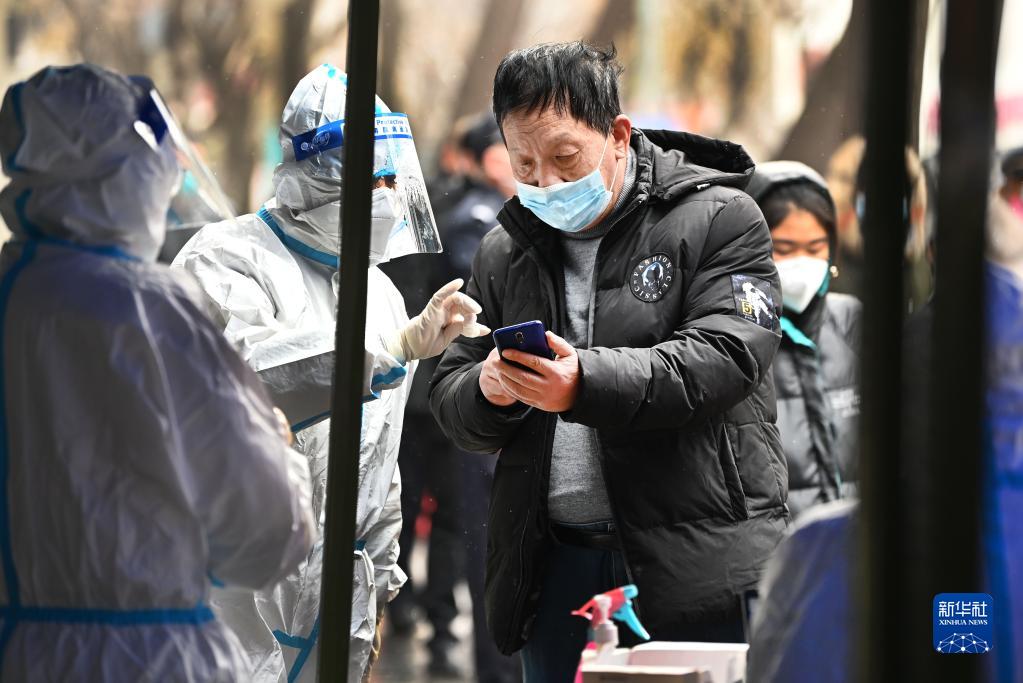 12月25日,防疫人員在西安市新城區皇城西路檢測點(diǎn)指導市民掃碼檢測。