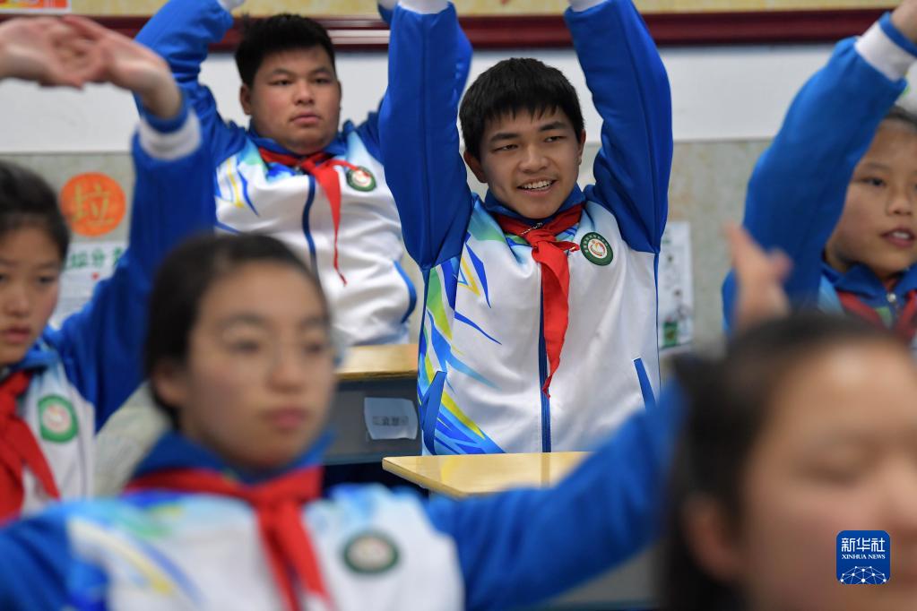在江西省宜春市特殊教育學(xué)校聽(tīng)障班教室,學(xué)生們在課間休息時(shí)練習舞蹈動(dòng)作,這是樊海艷自創(chuàng )的課間操(12月28日攝)。