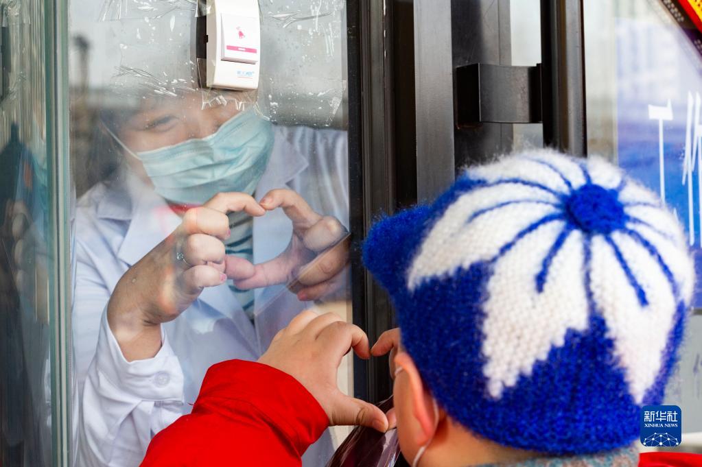 2021年2月11日,在黑龍江省哈爾濱市道外區一集中隔離點(diǎn),鄭瑩瑩和兒子順順隔著(zhù)玻璃門(mén)“比心”。鄭瑩瑩是哈爾濱市道外區人民醫院一名工作人員,正在一處集中隔離點(diǎn)值守。除夕上午,6歲的兒子順順來(lái)到隔離點(diǎn),給她帶來(lái)了一朵康乃馨。因疫情防控需要,母子倆隔著(zhù)賓館的玻璃門(mén)相望,完成了特殊的“除夕團圓”。