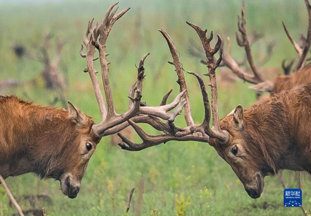 2021年5月17日,麋鹿在位于湖北省天鵝洲長(cháng)江故道邊的石首麋鹿國家級自然保護區內活動(dòng)。