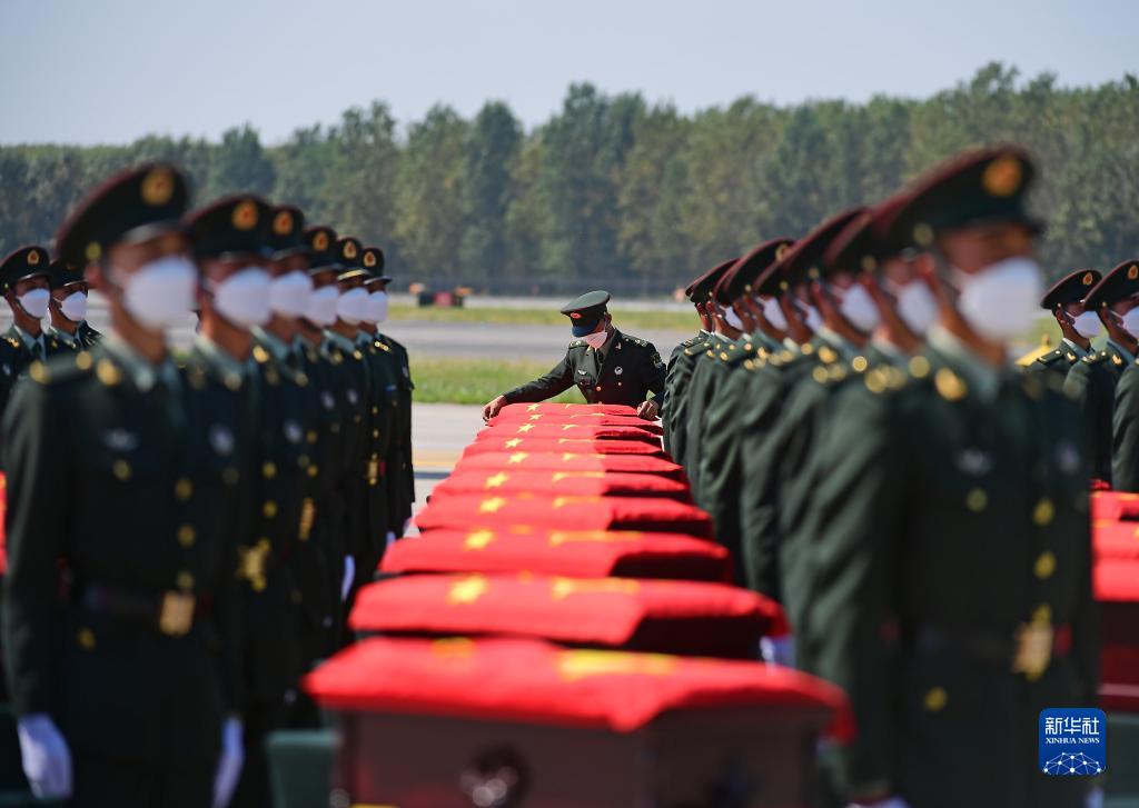 2021年9月2日,第八批在韓中國人民志愿軍烈士遺骸由我空軍專(zhuān)機護送從韓國接回遼寧沈陽(yáng),109位志愿軍烈士英靈及1226件相關(guān)遺物回到祖國懷抱。這是在沈陽(yáng)桃仙國際機場(chǎng),禮兵在殮放志愿軍烈士遺骸的棺槨上覆蓋國旗。