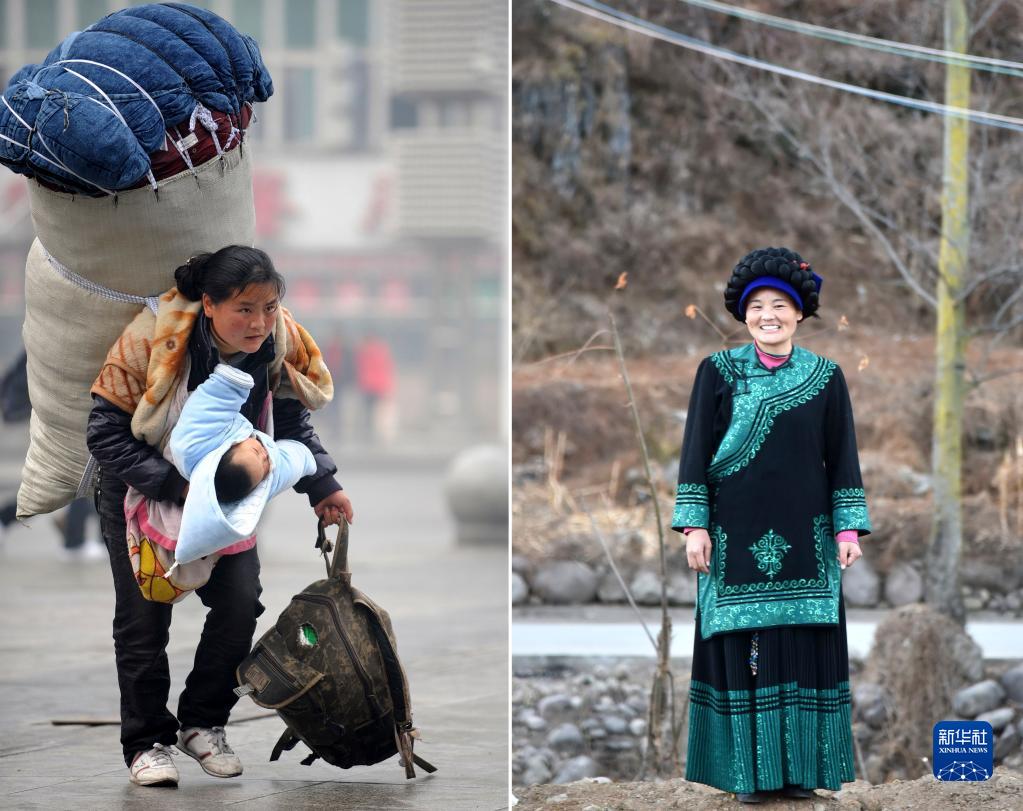 這是一張拼版照片。左圖為2010年1月30日,巴木玉布木背著(zhù)大包、抱著(zhù)孩子在南昌火車(chē)站匆忙趕車(chē);右圖為2021年1月22日在四川省涼山彝族自治州越西縣瓦巖鄉桃園村拍攝的身著(zhù)彝族服飾的巴木玉布木。