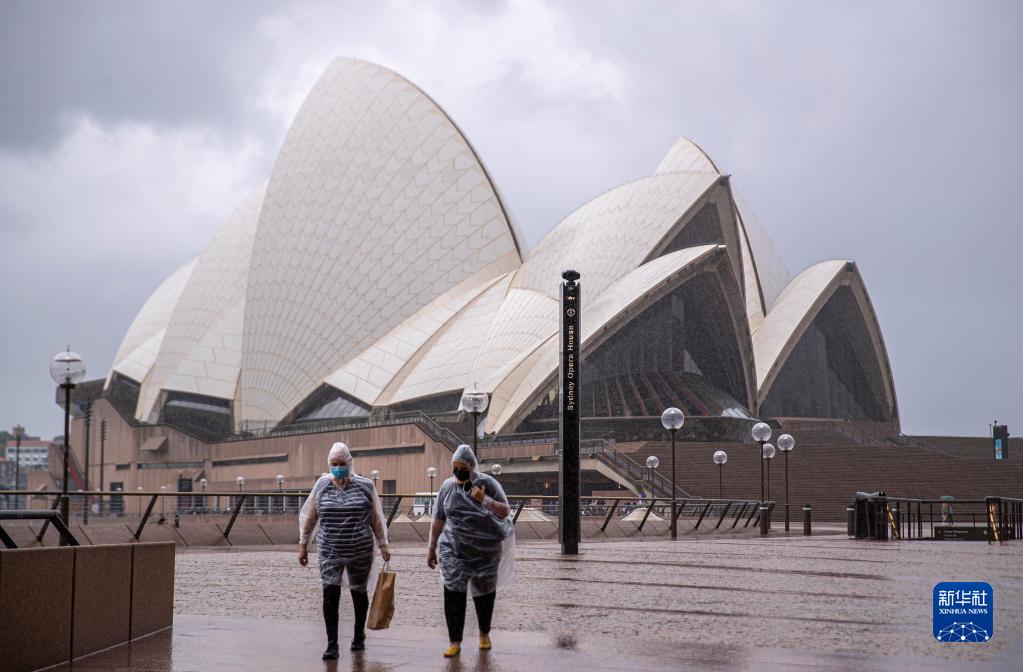 1月9日,兩名女子在雨中走過(guò)澳大利亞悉尼歌劇院。