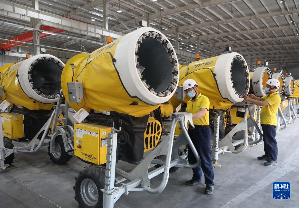 這是張家口高新區冰雪運動(dòng)裝備產(chǎn)業(yè)園內一家冰雪設備企業(yè)的工人在車(chē)間查驗造雪機質(zhì)量(2021年6月23日攝)。