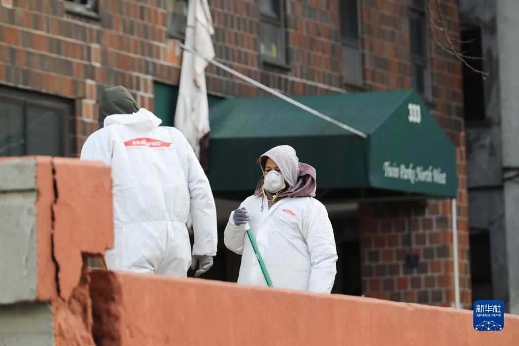 1月10日,工作人員在美國紐約市布朗克斯區發(fā)生火災的公寓樓外進(jìn)行清理工作。