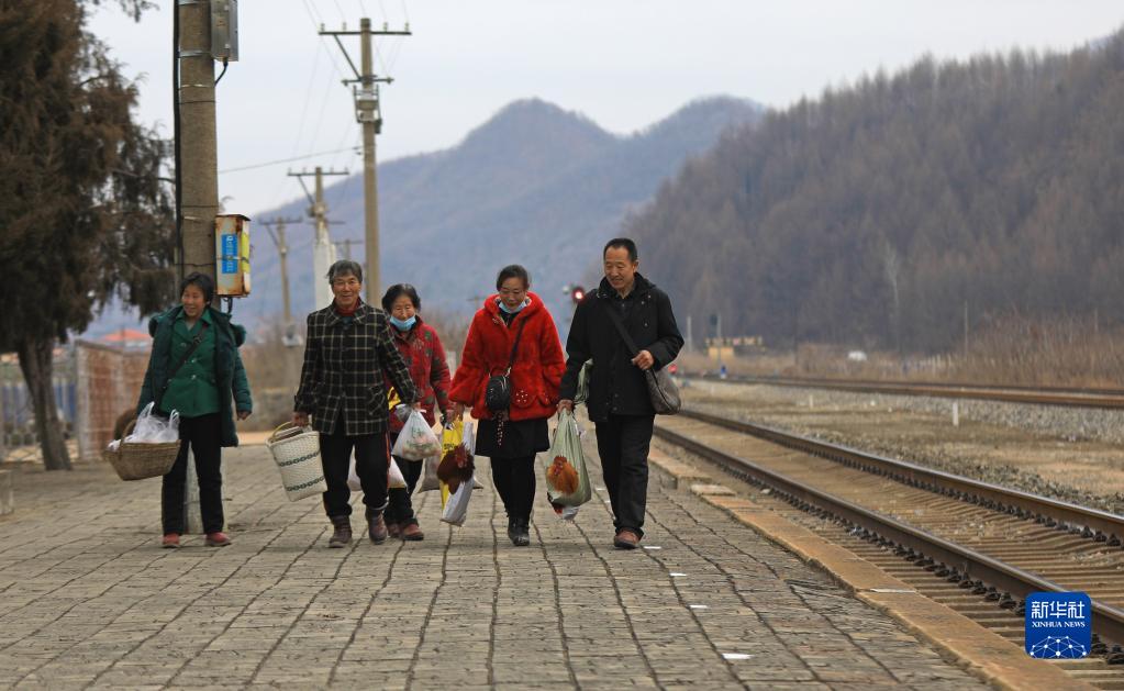 1月15日,在遼寧省鳳城市石城站,農民們帶著(zhù)各種山貨準備上車(chē)。