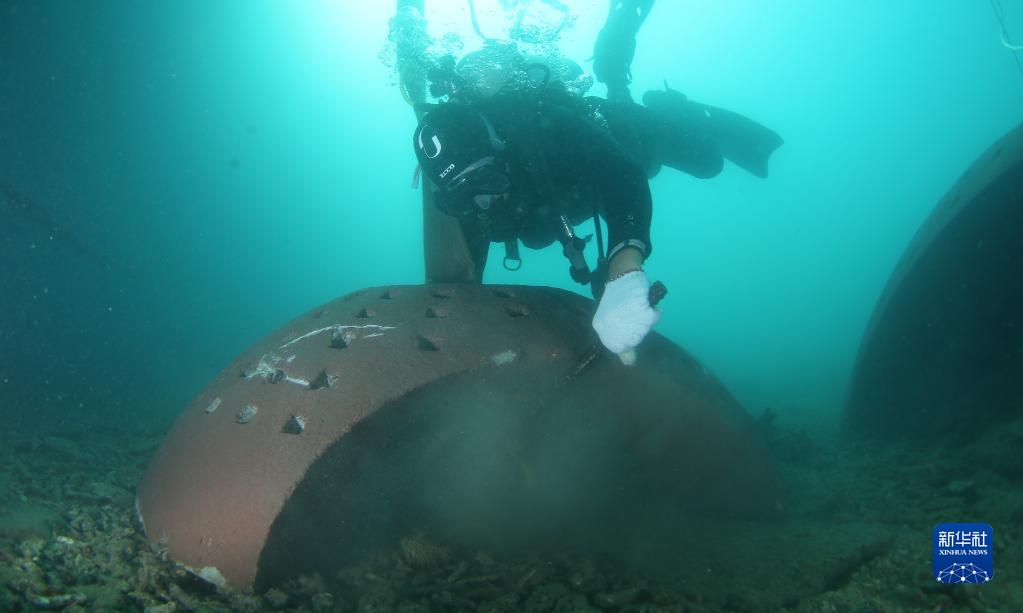 在亞龍灣相關(guān)海域,潛水員將人工生態(tài)礁沉入海底指定區域(1月19日攝)。