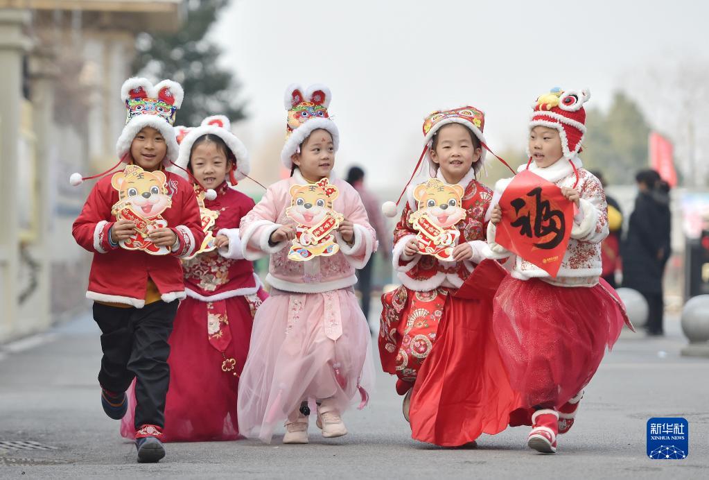 1月18日,在安徽省合肥市源水家園小區,頭戴虎頭帽的小朋友們手持“?!弊趾涂ㄍ槲?。