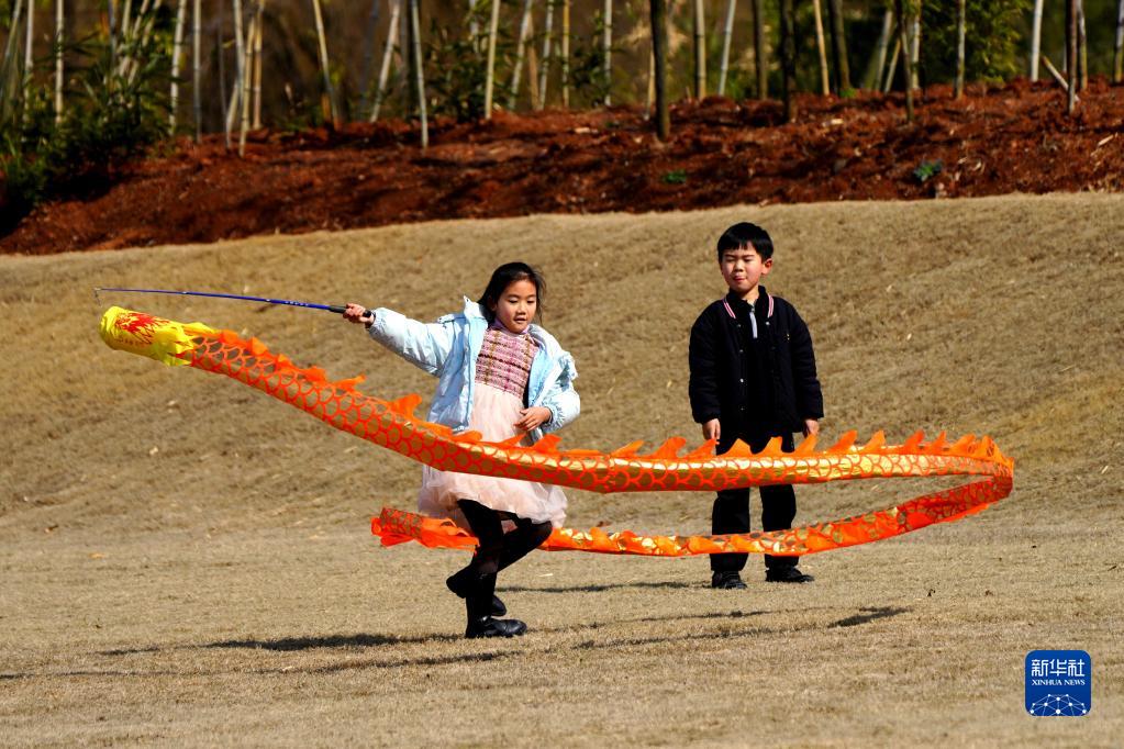2月4日,小朋友在上海辰山植物園玩舞龍。