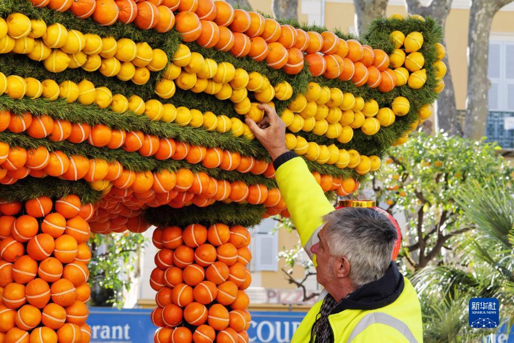 2月9日,一名工作人員在法國南部小城芒通裝飾檸檬節藝術(shù)裝置。