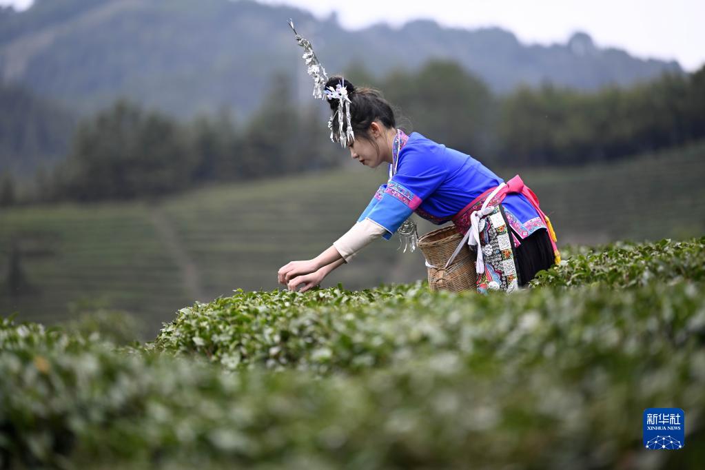 2月10日,在廣西柳州市三江侗族自治縣古宜鎮光輝村馬灣茶場(chǎng),一名侗族姑娘采摘早春茶。