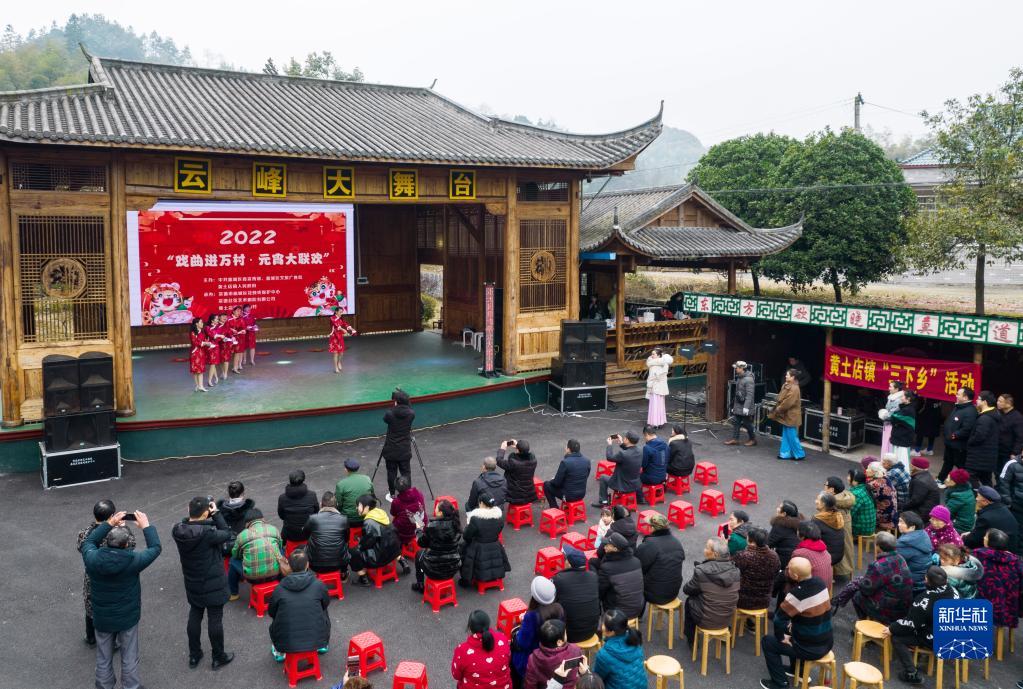 2月15日,湖南省常德市鼎城區花鼓戲保護中心演員在“戲曲進(jìn)萬(wàn)村·元宵大聯(lián)歡”送戲下鄉活動(dòng)上演出(無(wú)人機照片)。