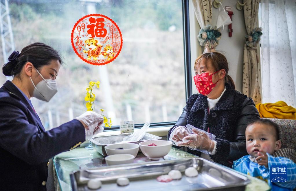 2月15日,在貴陽(yáng)開(kāi)往上海南的K112次列車(chē)上,貴陽(yáng)客運段乘務(wù)員和旅客一起包湯圓。