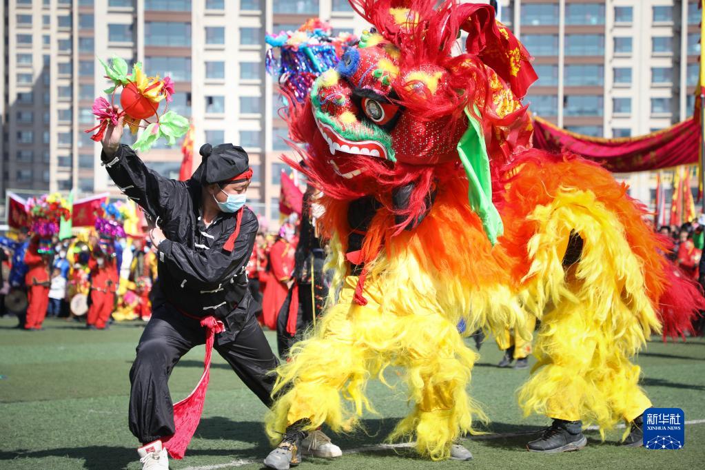 2月15日,甘肅省定西市渭源縣的社火演員在表演舞獅。