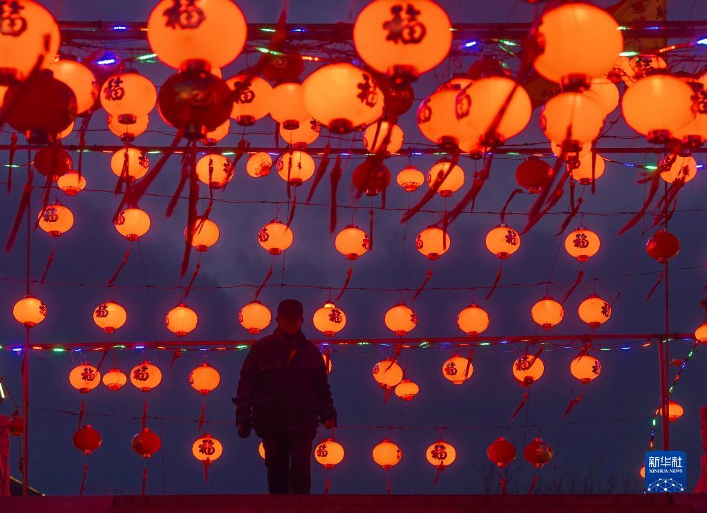 2月14日,游人在山東省膠州市板橋鎮景區賞燈游玩。