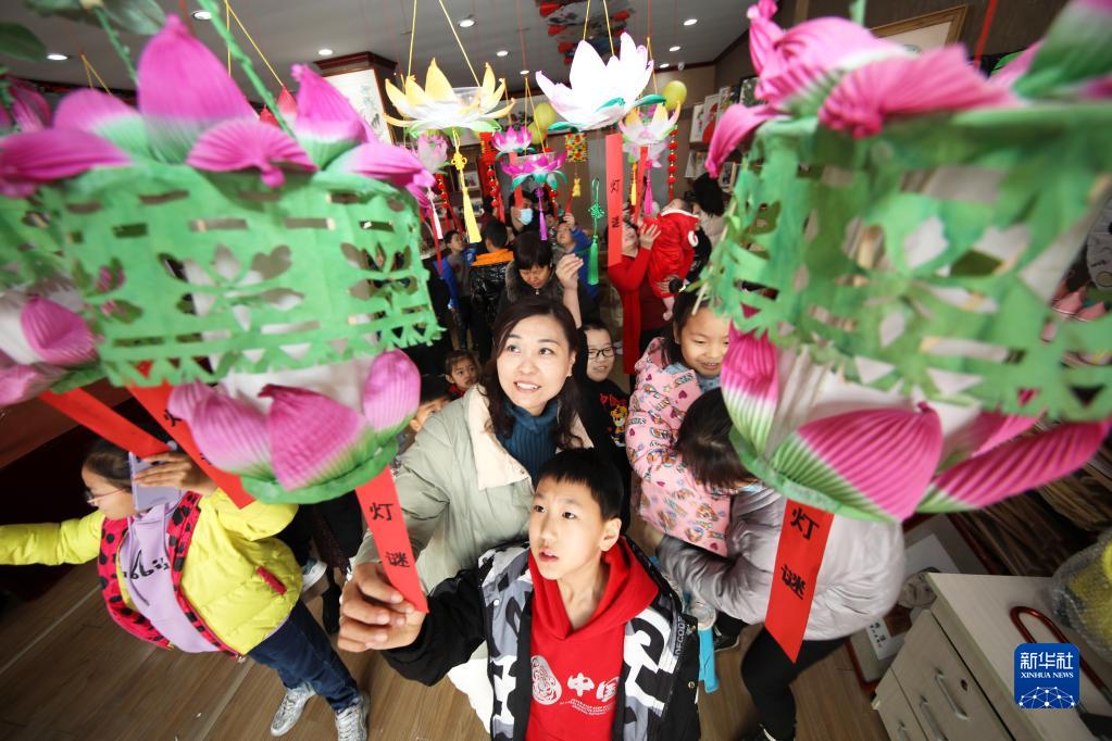 2月15日,在山東省濱州市無(wú)棣縣,家長(cháng)和孩子們在“猜燈謎慶元宵”活動(dòng)中猜燈謎。