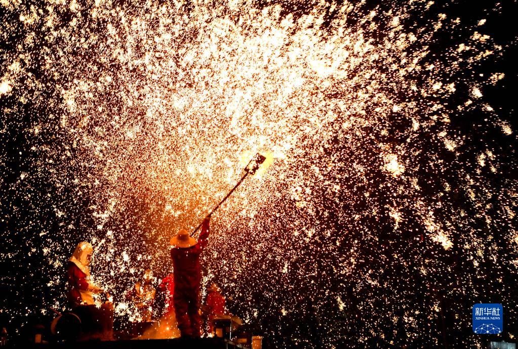 2月14日,在河南省洛陽(yáng)市洛龍區隋唐城遺址植物園,民俗藝人為市民、游客表演“打鐵花”,喜迎元宵佳節。