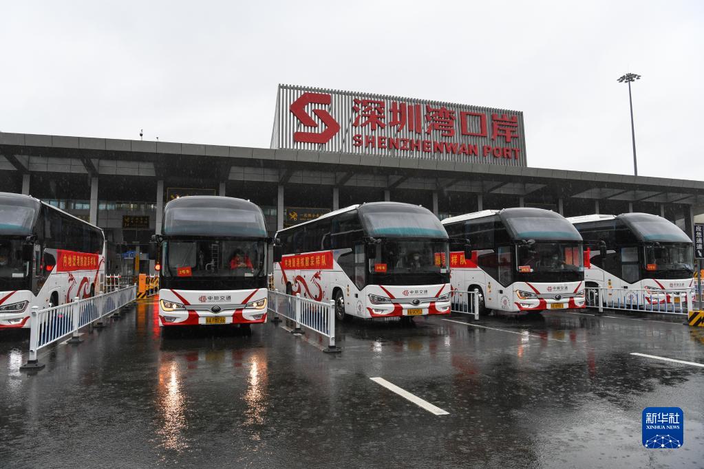 2月19日下午,第二批內地援港抗疫醫療防疫工作隊乘坐大巴抵達深圳灣口岸。