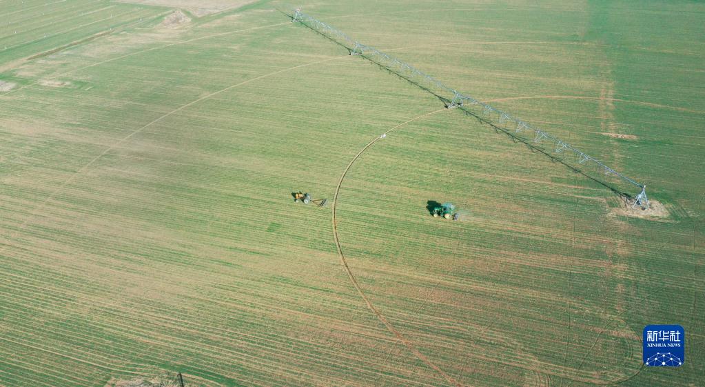 2月21日,山東省鄒平市高新街道周東村種糧大戶(hù)在專(zhuān)業(yè)合作社的高標準農田里作業(yè)(無(wú)人機照片)。