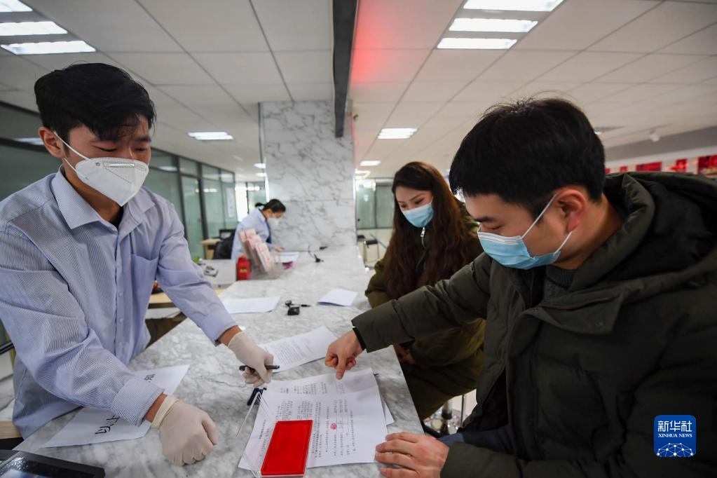 2月22日,新人在內蒙古呼和浩特市回民區市民服務(wù)中心內辦理結婚手續。