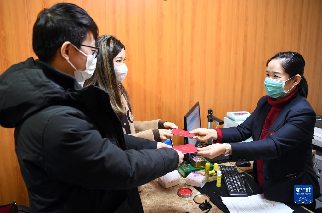 2月22日,北京市海淀區民政局婚姻登記處的工作人員(右)向一對新人頒發(fā)結婚證。