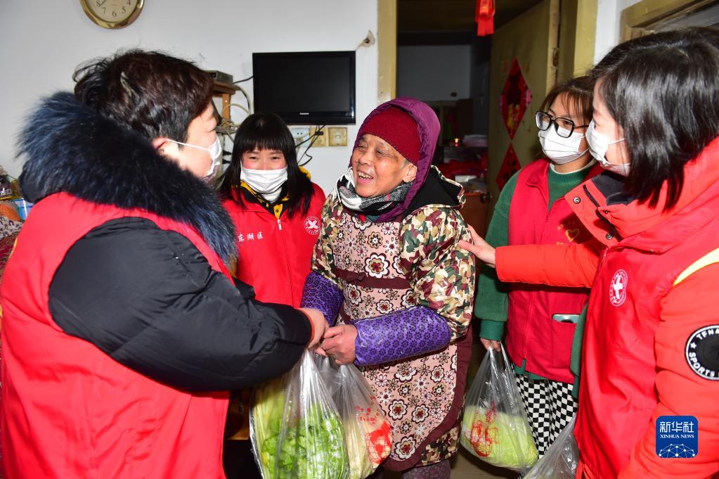 2月23日,在江西省南昌市東湖區董家窯街道青陽(yáng)社區,志愿者給肖招姺老人(中)送代購的蔬菜。