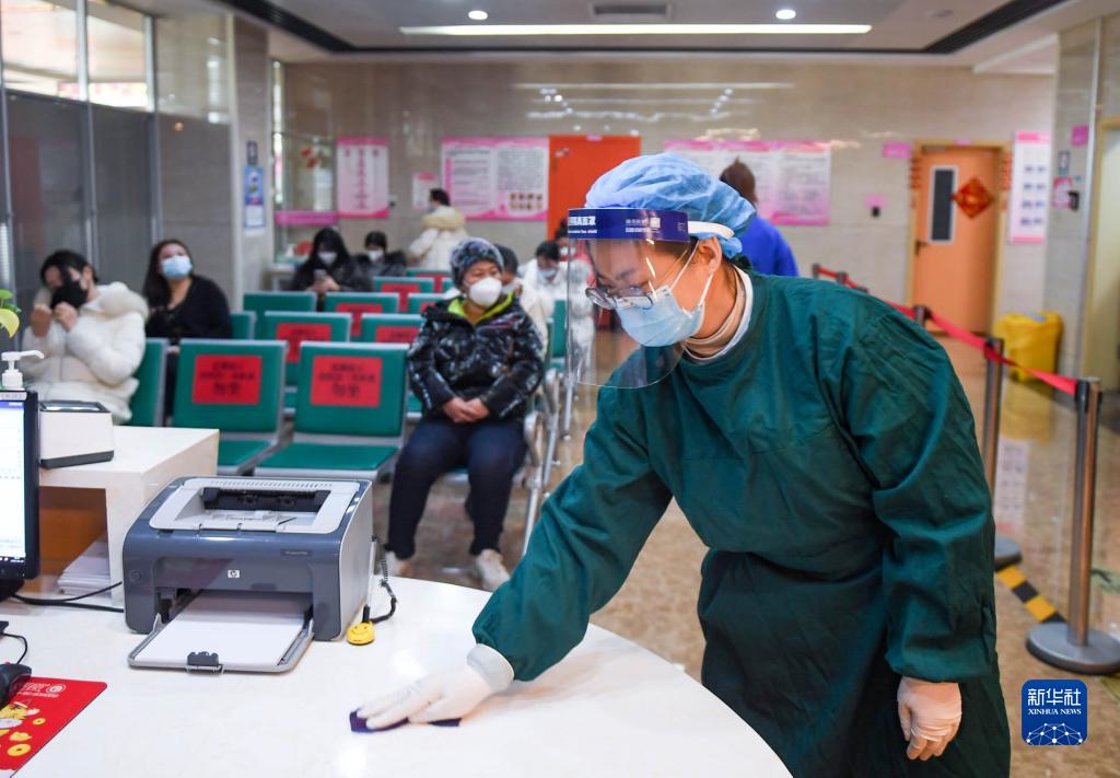 2月23日,在呼和浩特市婦幼保健院超聲科,醫務(wù)人員用酒精擦拭分診臺。