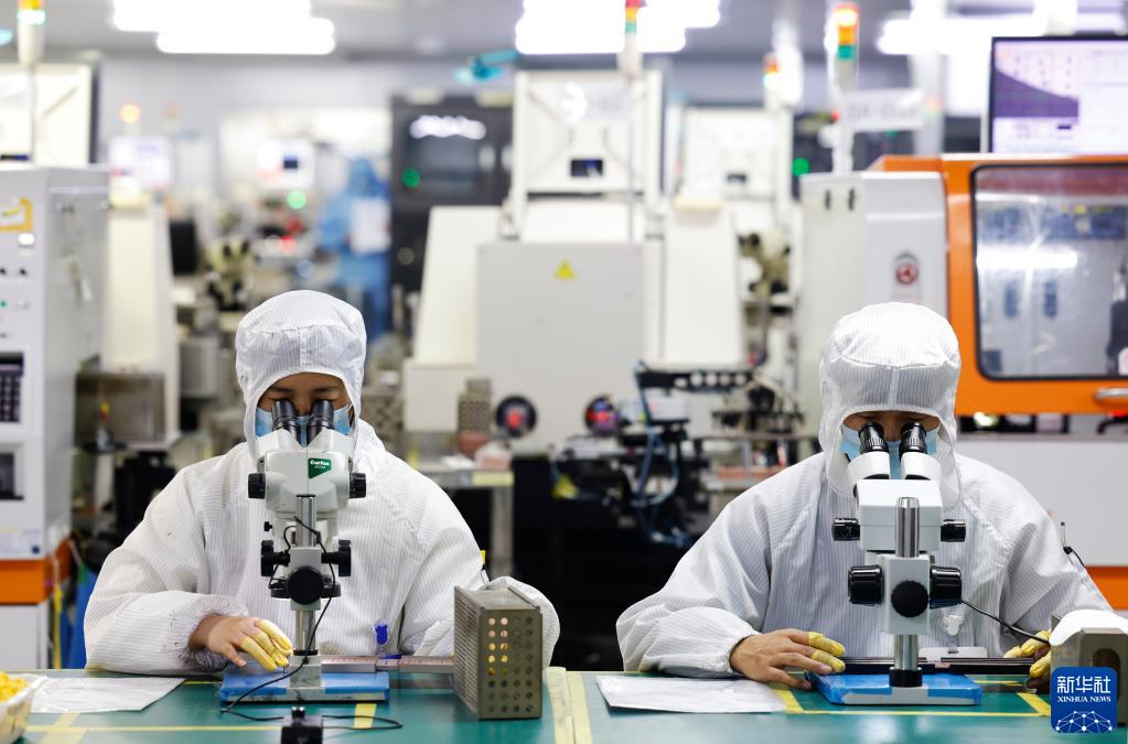 2月23日,在泗洪經(jīng)濟開(kāi)發(fā)區一電子企業(yè)生產(chǎn)車(chē)間內,工人生產(chǎn)出口的芯片。