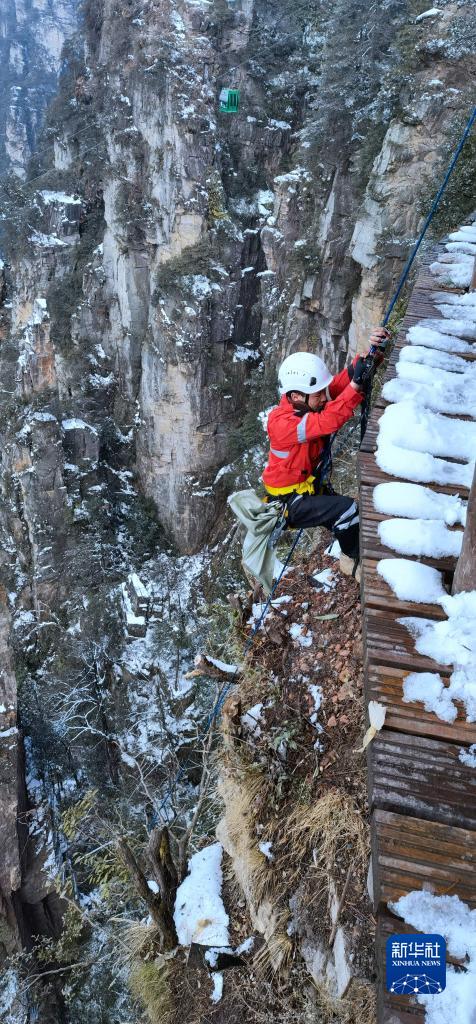 當日,湖南張家界雪后初霽,張家界市武陵源山地應急救援隊隊員來(lái)到黃石寨景區,在懸崖峭壁間開(kāi)展低溫冰雪條件下的應急救援索降訓練,以提高應對惡劣氣候和環(huán)境下的應急救援能力。這支救援隊每年不定期組織訓練,被游客親切地稱(chēng)為“紅衣俠”。