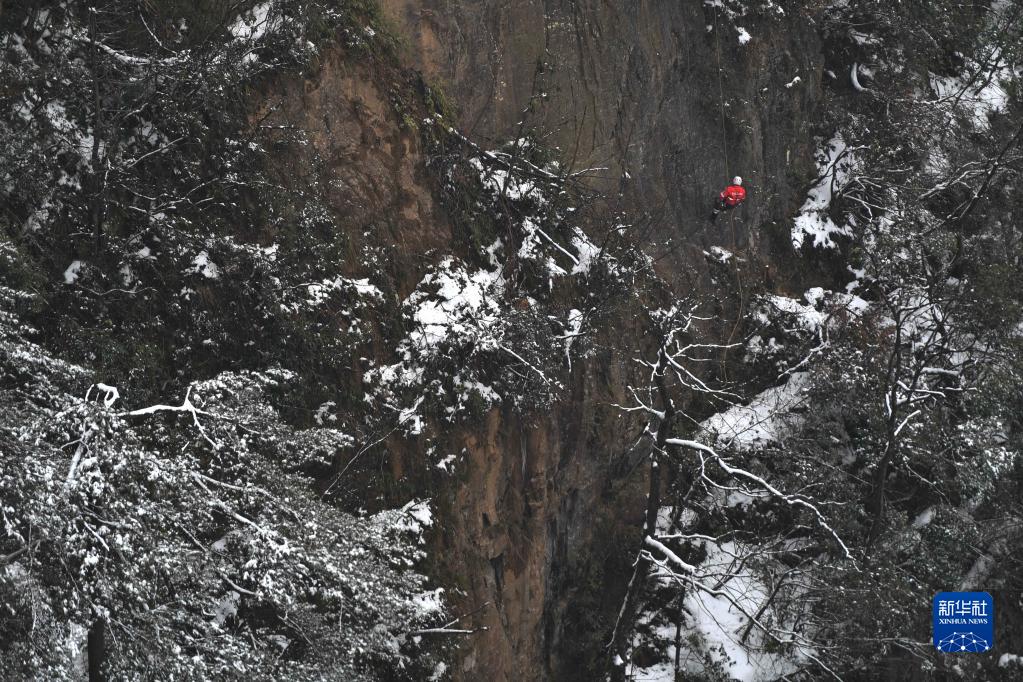 當日,湖南張家界雪后初霽,張家界市武陵源山地應急救援隊隊員來(lái)到黃石寨景區,在懸崖峭壁間開(kāi)展低溫冰雪條件下的應急救援索降訓練,以提高應對惡劣氣候和環(huán)境下的應急救援能力。這支救援隊每年不定期組織訓練,被游客親切地稱(chēng)為“紅衣俠”。