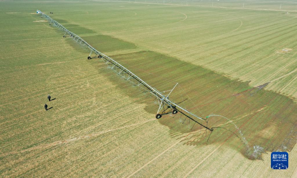 2月23日,山東省鄒平市長(cháng)山鎮田家村永豐合作社農民在農場(chǎng)農業(yè)科技示范基地進(jìn)行節水一體化灌溉(無(wú)人機照片)。