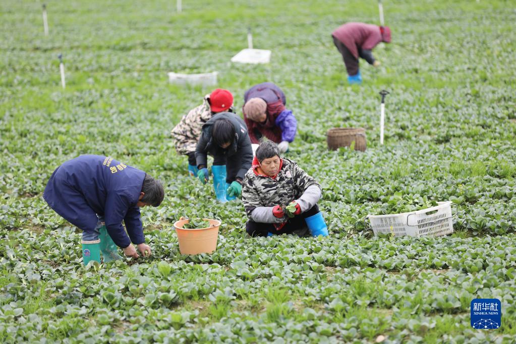 2月23日,在湖南省永州市道縣清塘鎮陳熊村蔬菜基地,村民在采收蔬菜。