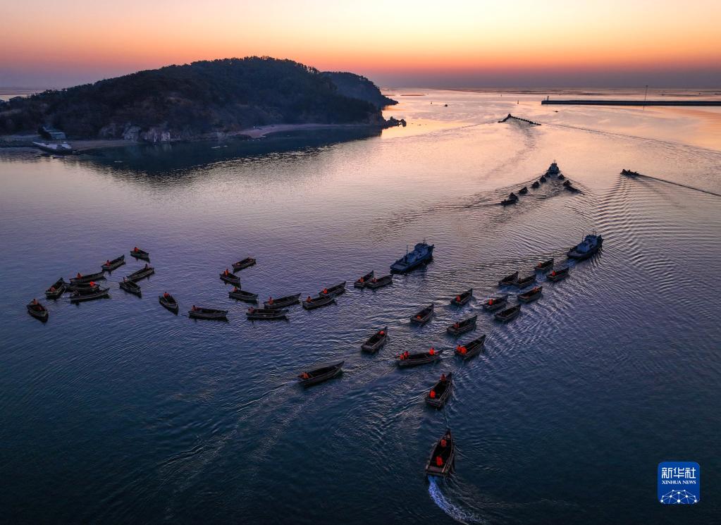 2月24日,在山東省榮成市俚島鎮俚島灣海域,漁民們駕駛著(zhù)漁船、舢舨迎著(zhù)朝陽(yáng)出海作業(yè)(無(wú)人機照片)。