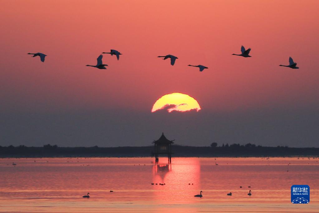 2月24日清晨,在山東榮成天鵝湖畔,一群大天鵝映著(zhù)日出飛翔。