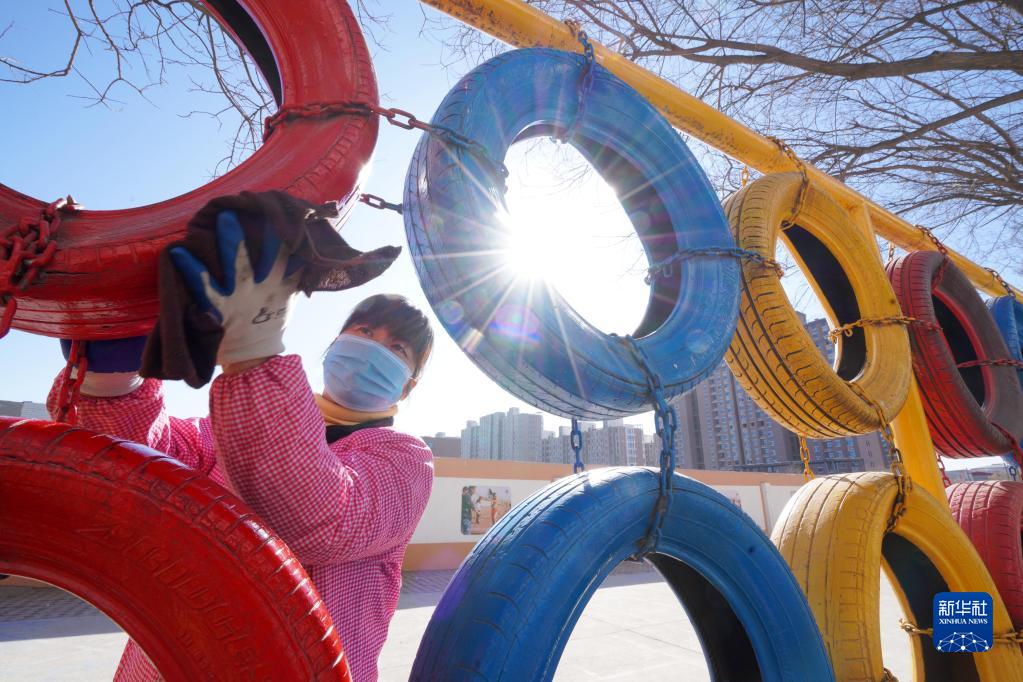 2月26日,在河北省邢臺市內丘縣新西關(guān)小學(xué),工作人員在清潔體育設施。