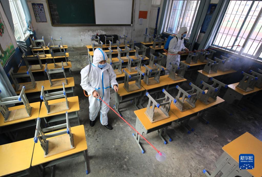 2月26日,在貴州省從江縣剛邊鄉中心小學(xué),工作人員在教室內消殺。
