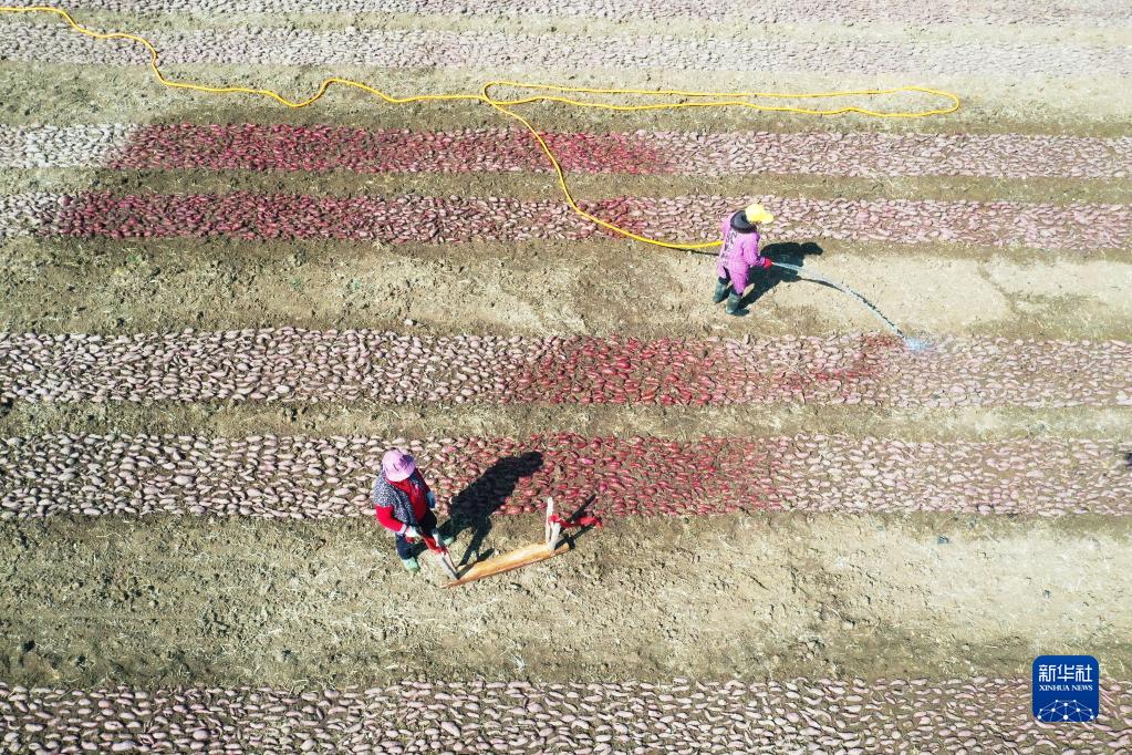 2月27日,江蘇省宿遷市泗洪縣龍集鎮河口村農民在田間培育紅薯苗(無(wú)人機照片)。