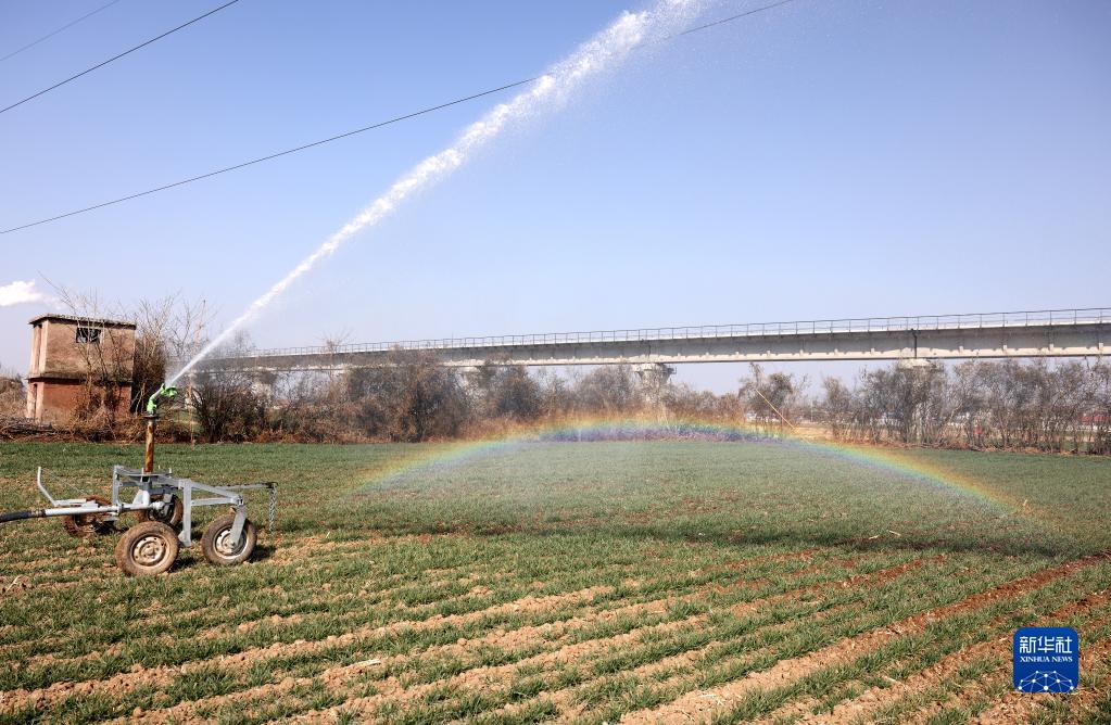 2月27日,山東省棗莊市市中區一種植專(zhuān)業(yè)合作社的農民利用卷盤(pán)式噴灌機為小麥澆返青水。