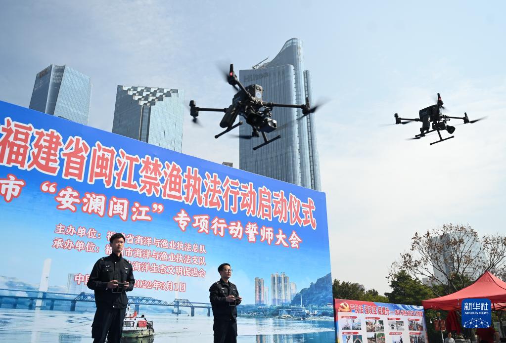 3月1日,2022年閩江禁漁首次聯(lián)合執法行動(dòng)派出無(wú)人機巡查執法。
