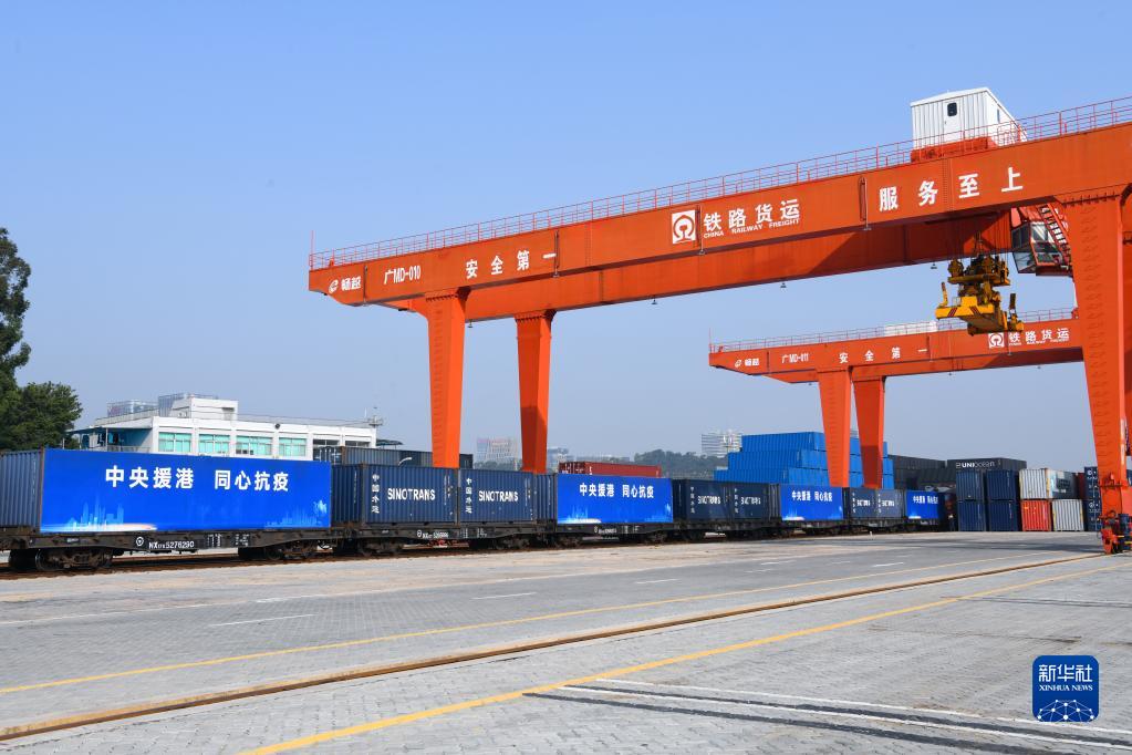 3月2日,在深圳平湖南國家物流樞紐,首趟“中央援港 同心抗疫”鐵路援港班列整裝待發(fā)。