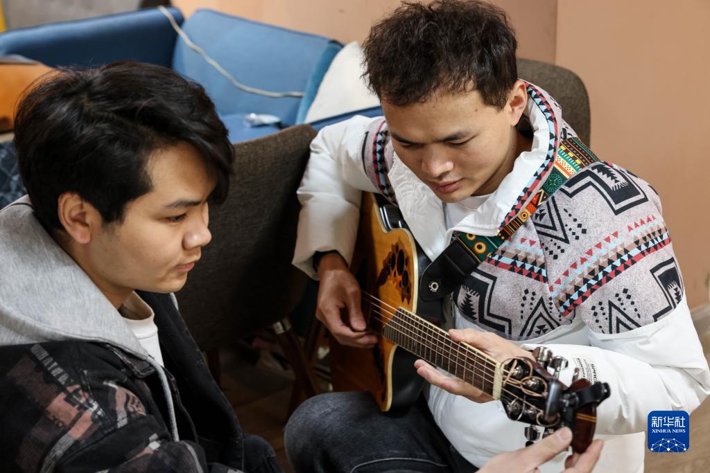 3月1日,“折耳根”樂(lè )隊貝斯手彭萬(wàn)海(左)在幫助吉他手楊志調音。
