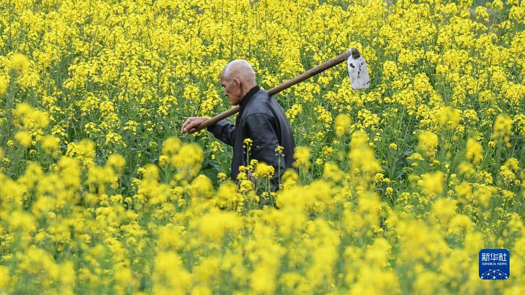 3月2日,在廣西融安縣潭頭鄉龍官村,一名農民護理油菜田。