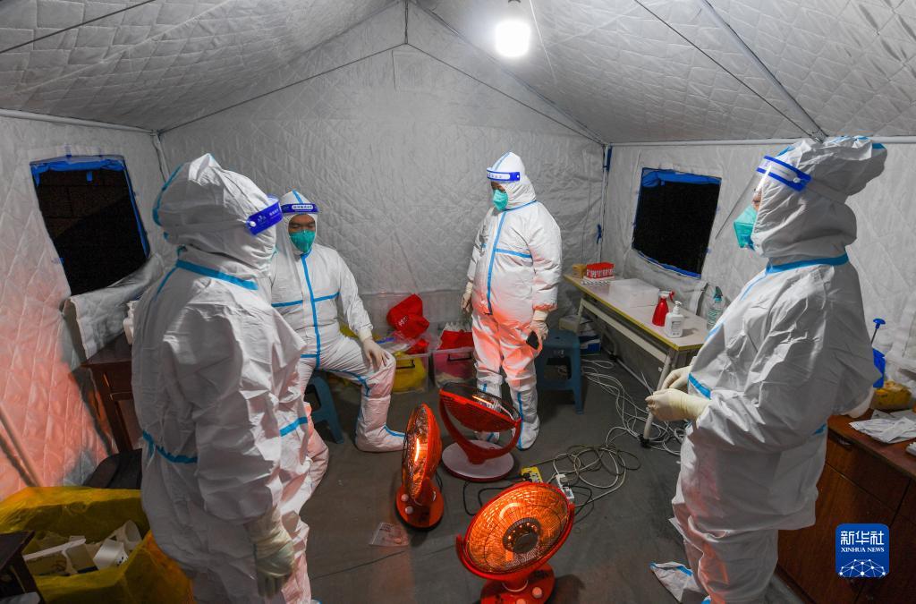 3月4日清晨,在呼和浩特市新城區星火巷社區臨時(shí)核酸檢測點(diǎn),工作人員在空閑時(shí)休息取暖。