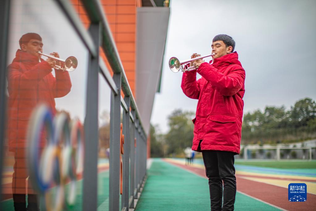 圖為在重慶市特殊教育中心,揚帆管樂(lè )團小號手王太樊在操場(chǎng)上練習國際殘奧委會(huì )會(huì )歌《未來(lái)贊美詩(shī)》小號聲部(1月26日攝)。