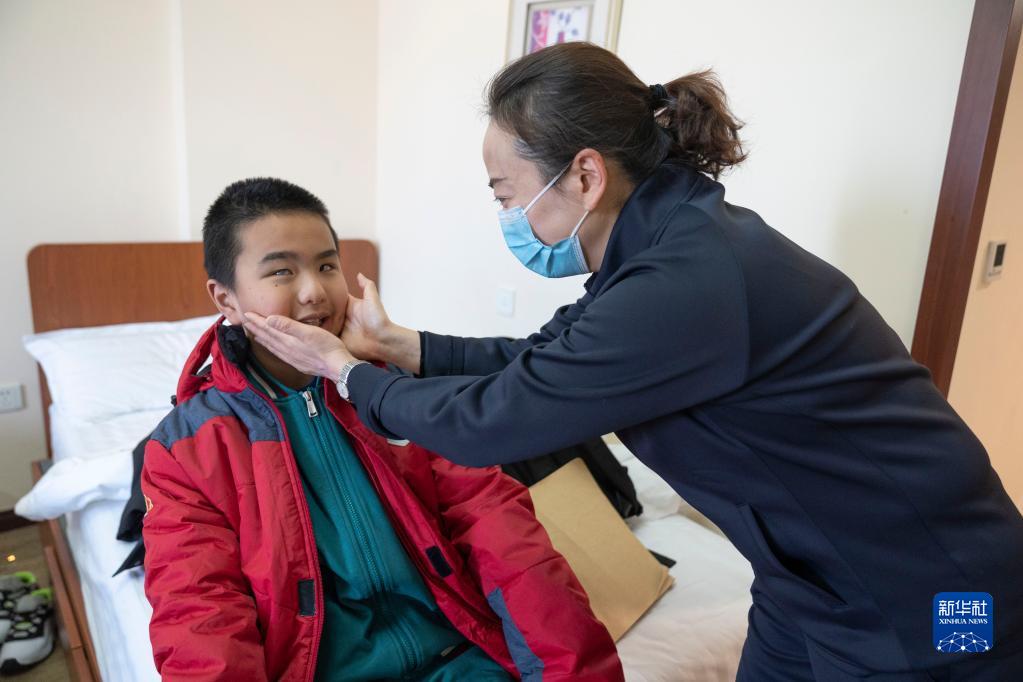 圖為在北京順義區中國殘疾人體育運動(dòng)管理中心,重慶市特殊教育中心校長(cháng)助理周遠琦(右)與揚帆管樂(lè )團參演團隊年齡最小的學(xué)生、10歲的吳浩嶼在宿舍交流(3月2日攝)。