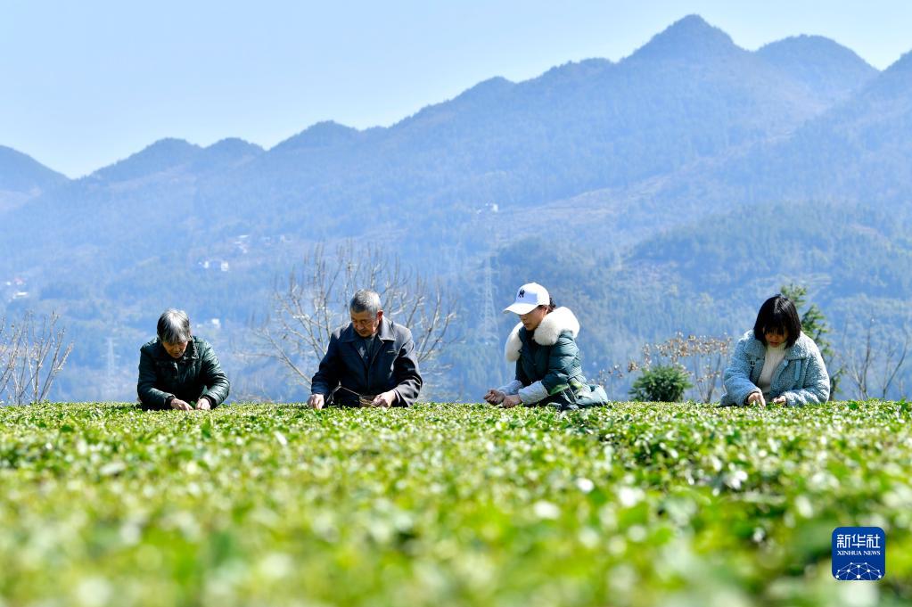 3月8日,茶農在湖北省宣恩縣萬(wàn)寨鄉長(cháng)堰溝村的茶園里采茶。