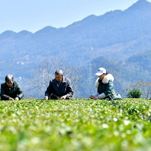 春暖茶山,春茶萌芽,茶農們采摘茶葉嫩芽,供應市場(chǎng)。