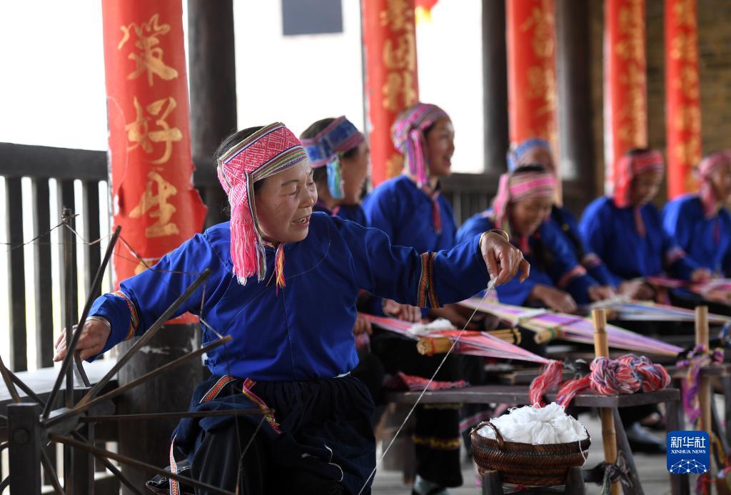 在廣西賀州市富川瑤族自治縣朝東鎮岔山村,當地村民為游客展示民族紡織技藝(3月12日攝)。