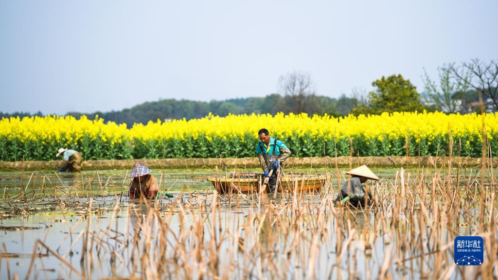 3月13日,在湖南省衡陽(yáng)市常寧市板橋鎮板橋村,藕農在采收蓮藕。