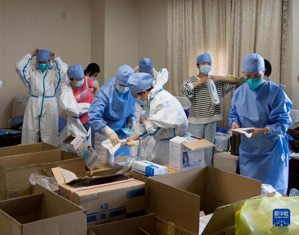 3月14日,香花橋街道社區衛生服務(wù)中心的醫務(wù)人員在某高校開(kāi)始穿著(zhù)防護衣物,準備進(jìn)行檢測。